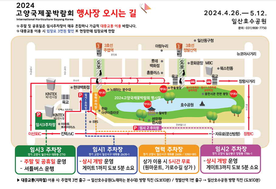 ▶고양국제꽃박람회 가는 길 : 주차장은 무료로 운영되지만 축제 기간동안 많은 사람이 방문할 예정이므로 되도록이면