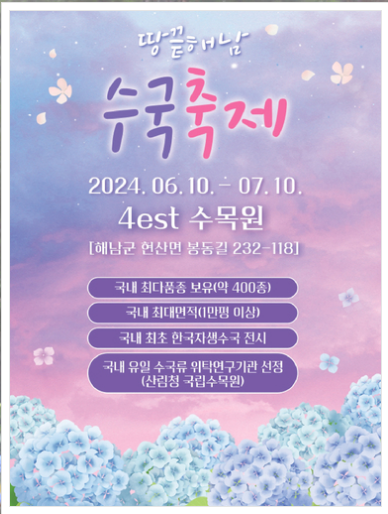 수국의 계절 곳곳에 만개한 수국이 한창입니다. 수국 하면 제주도를 떠올리시는 분들이 많으실 텐데 제주도외에도 수국을 즐길 수 있는 장소는 아주 많답니다. 전국의 수국 명소중 남쪽 지방에 있는 수국 명소들을 한 번 찾아봤습니다.