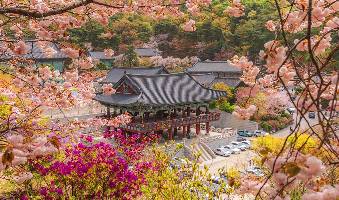 천안 각원사는 MZ세대들이 즐겨찾는 겹벚꽃 명소입니다. 4월 15일경 만개할것이라 예상하고 있는데요 풍성한 겹벚꽃 뿐만 아니라 홀벚꽃, 능수벚꽃 등 다양한 형태의 벚꽃을 감상할수 있으며 특히, 높이 15m, 무게60톤에 달하는 청동대불 앞으로 벚꽃이 흐드러지게 피어난 아름다운 풍경은 놓칠수 없는 절경이라고 할수 있습니다.