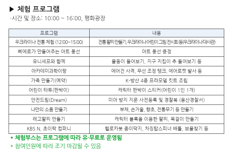 2024 전쟁기념과 어린이날 문화축제는 어린이날을 맞아 전쟁으로 고통받는 우크라이나 어린이들을 돕기 위해 나눔과 기부를 실천하고 체험할수 있는 특별한 시간을 경험할수 있는 행사입니다. 선착순 어린이 700명에게는 선물 증정 및 천원의 기부기 이루어집니다. 다양한 체험프로그램과 예약 프로그램, 해설프로그램 등이 운영되며 특별공연과 이벤트가 기다리고 있어요