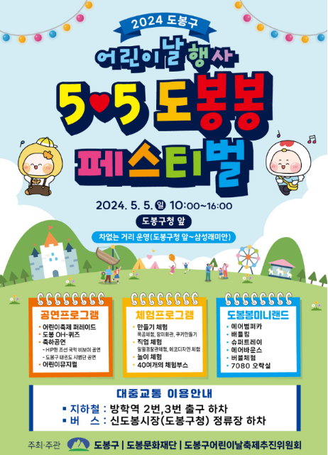 도봉구에서 2024 어린이날 축제 "5♥5 도봉봉 페스티벌"을 개최합니다. 도봉구 어린이날 차없는 거리행사에 따른 교통통제로 관내 버스가 임시우회운행을 한다고 하니 아래 우회노선을 확인하시어 대중교통 이용시 참고하시기 바래요.교통통제구간은 도봉구청~ 삼성 레미안 아파트 입니다